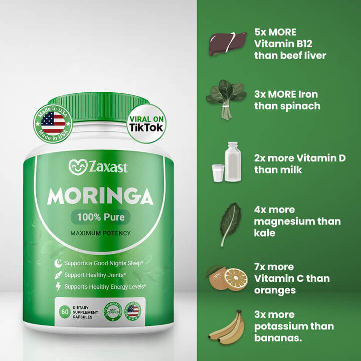 Zaxast Moringa delivers maximum potency with 100% pure ingredients. With more Vitamin B12 than beef liver, more iron than spinach, and more magnesium than kale — it’s not just a supplement, it’s your new health essential. Carefully formulated and proudly made in the USA for optimal results.
